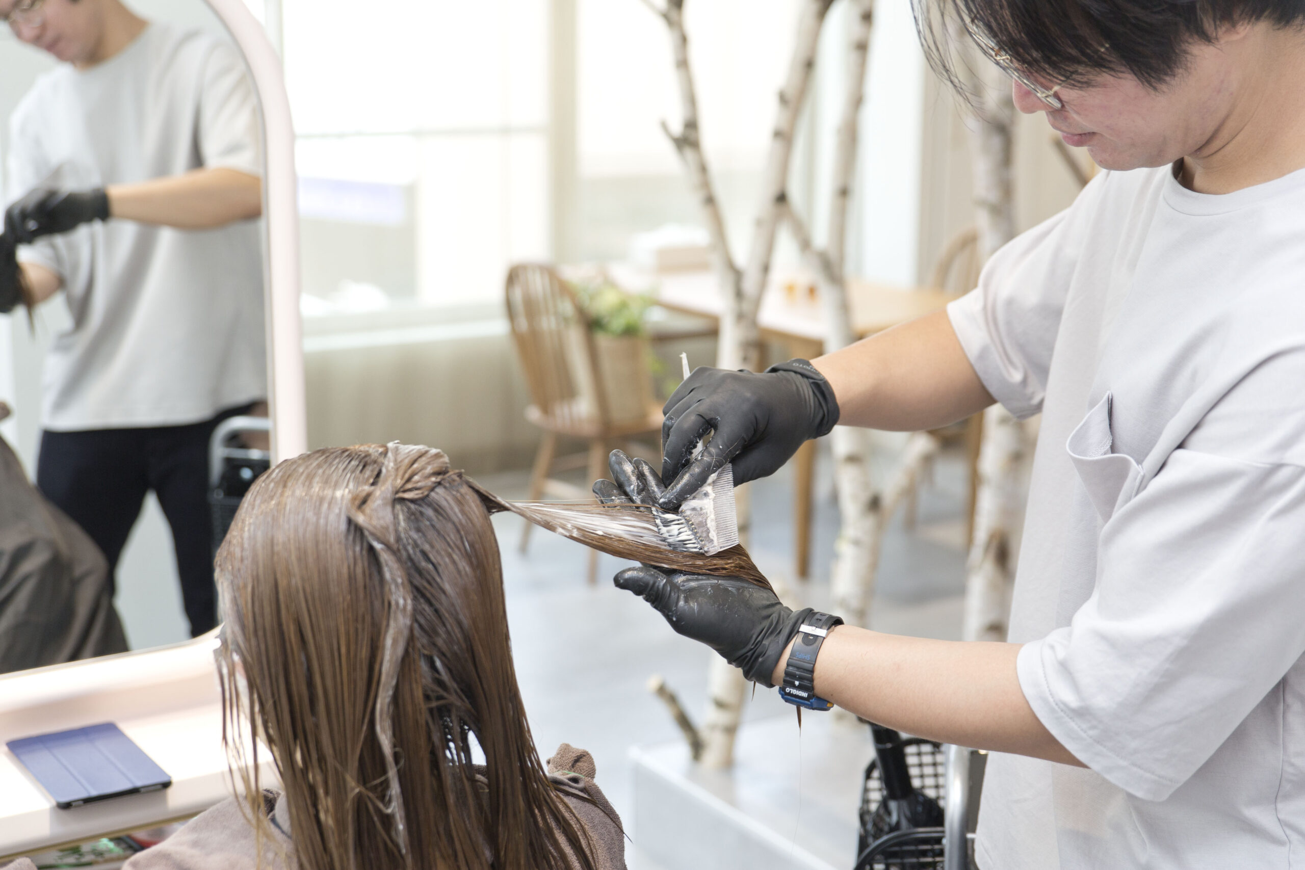 髪質や髪の状態に合わせて根元と毛先のカラー剤を塗り分けて丁寧に施術していきます。