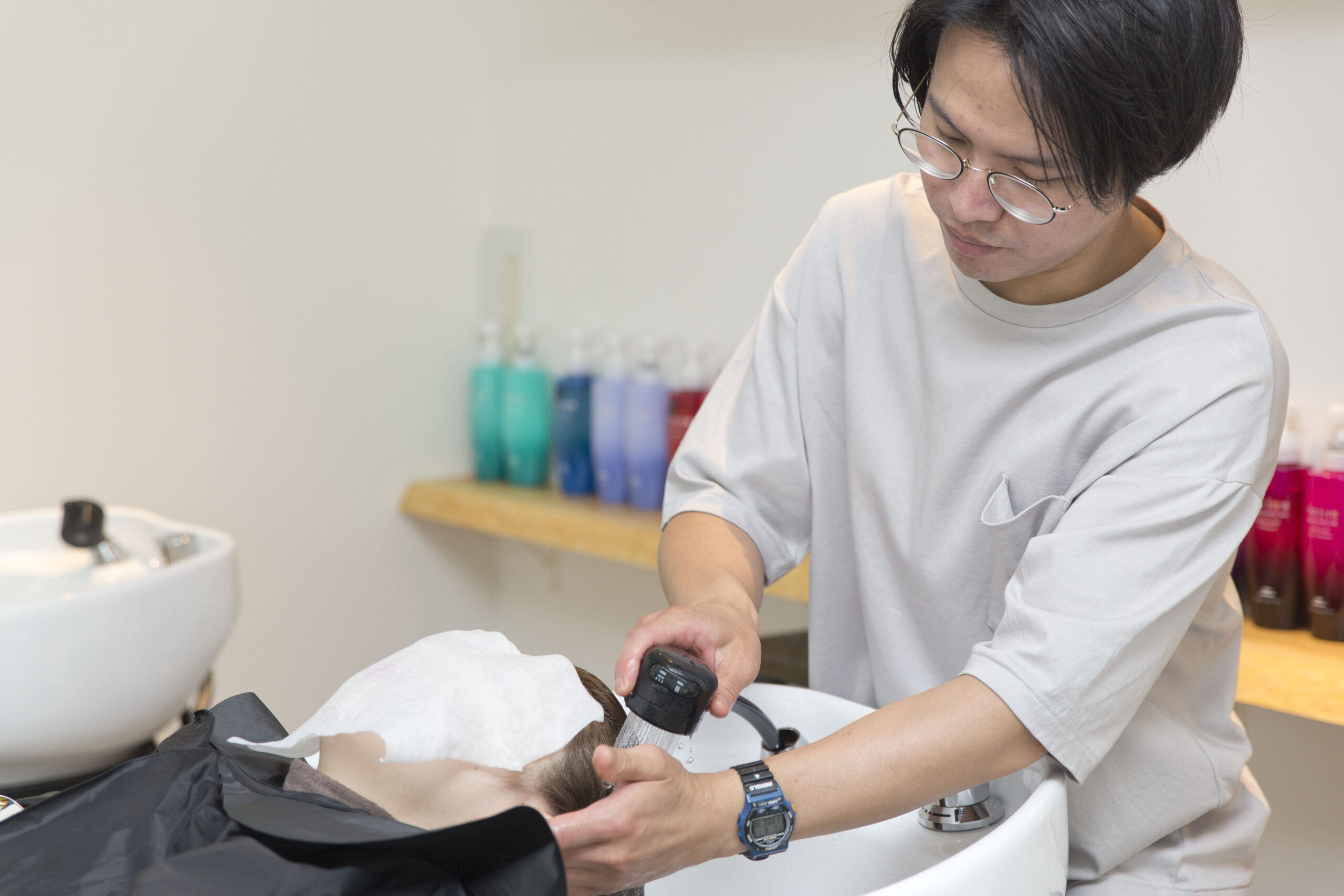 髪と頭皮に優しいオージュアシャンプーで、カラー剤が地肌に残らないように丁寧にシャンプーします。