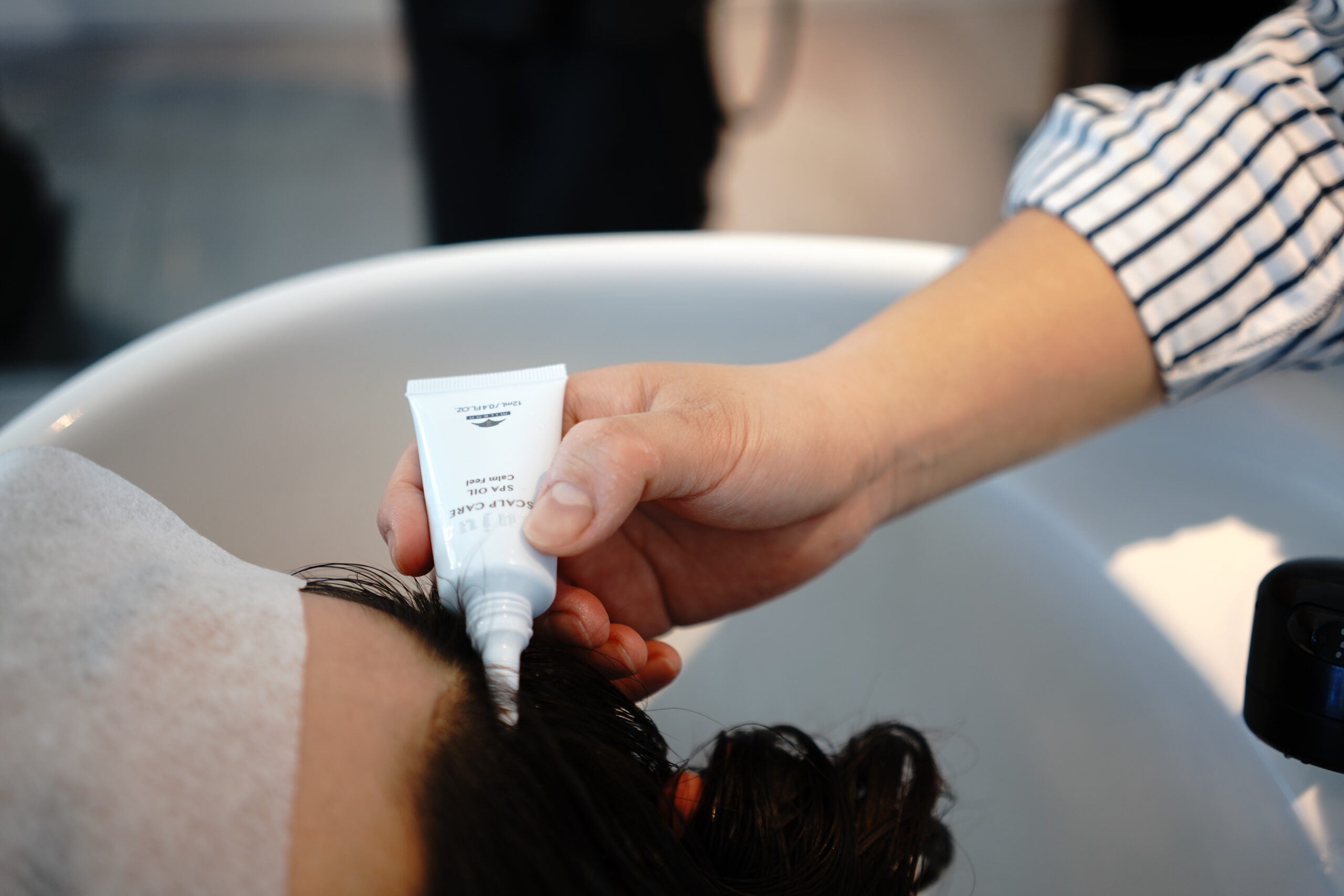 頭皮用のアロマオイルで10分間の頭皮マッサージをしていきます。