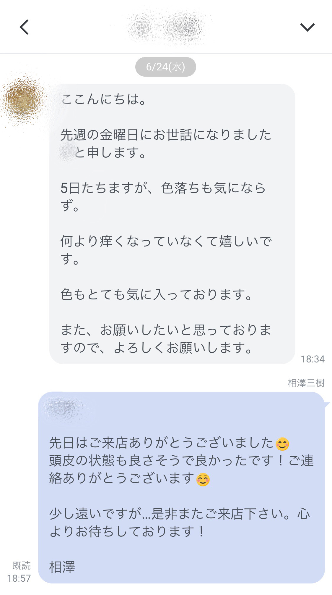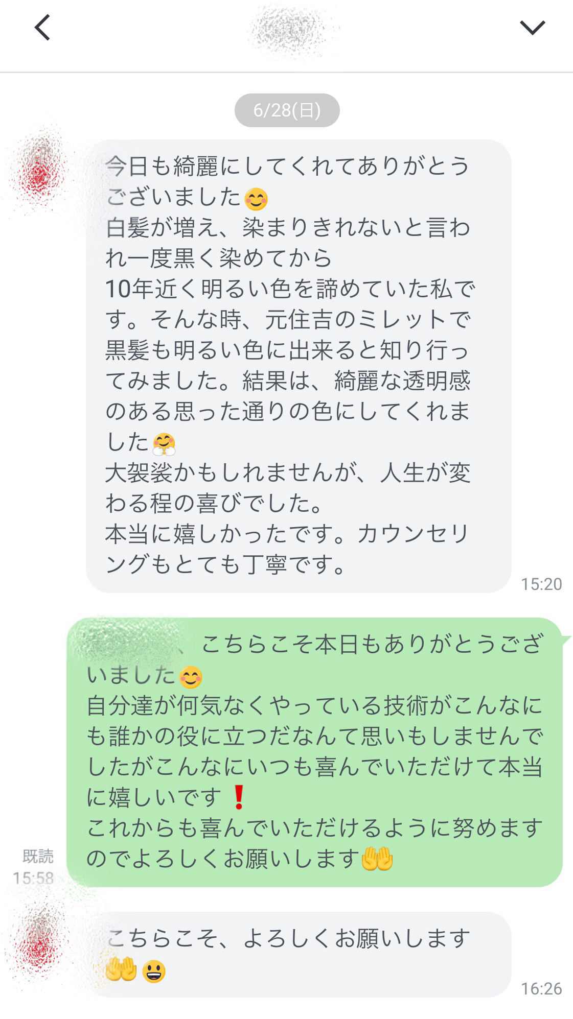 来店からそろそろ2週間経ちます。以前は2週間もすると白髪が目立ち、染めないととストレスに感じる頃ですが、今のところ大丈夫そうです。ありがとうございました。