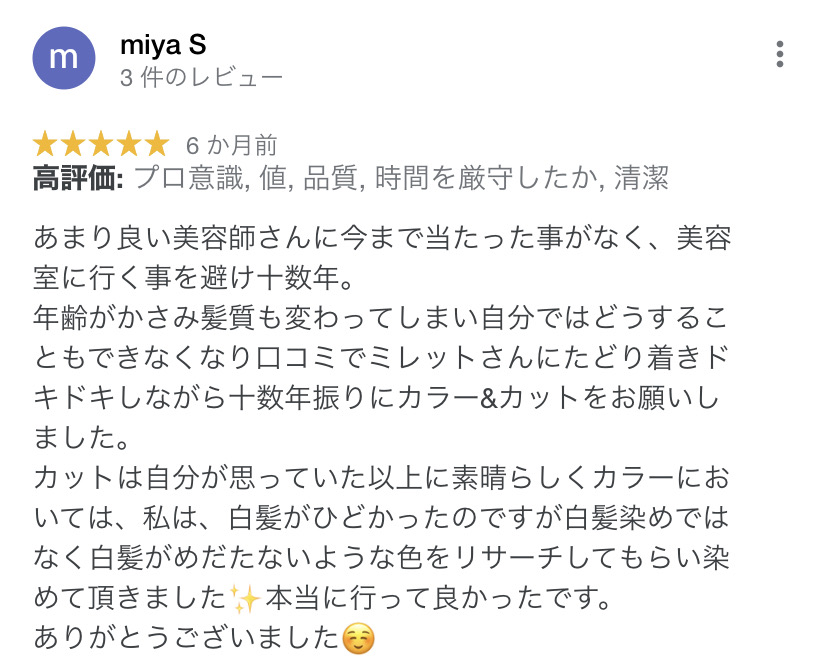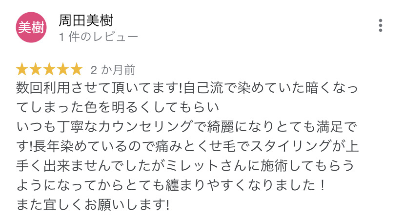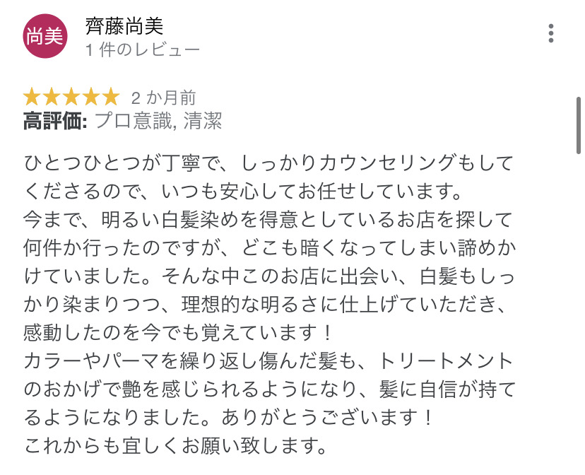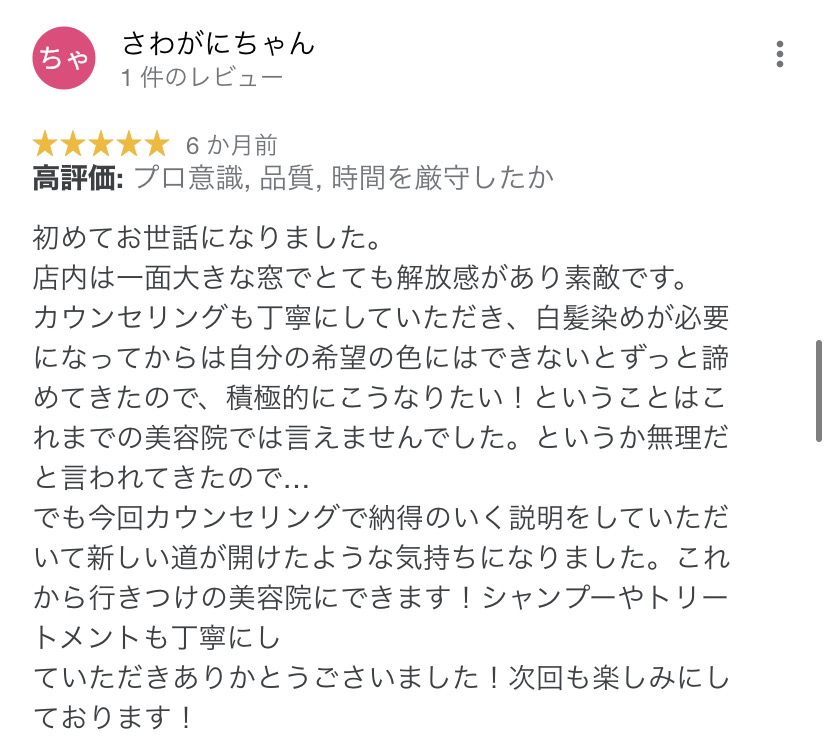 そんな中このお店に出会い、白髪もしっかり染まりつつ、理想的な明るさに仕上げていただき、感動したのを今でも覚えています!