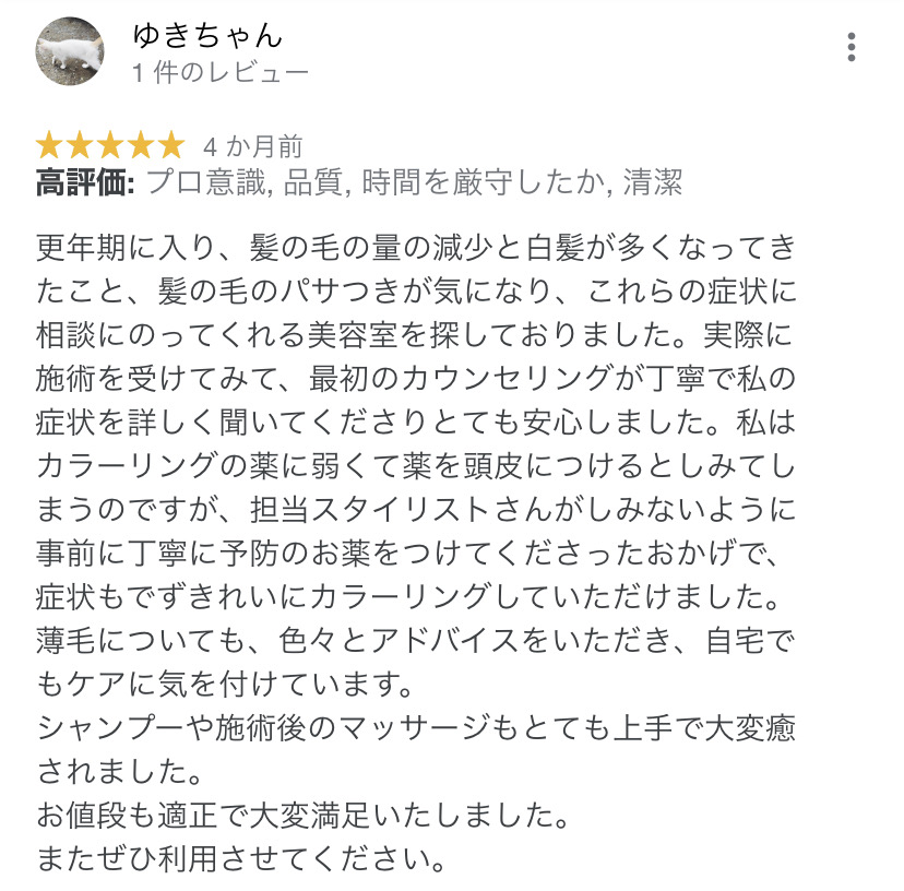 更年期に入り、髪の毛の量の減少と白髪が多くなってきたこと、髪の毛のパサつきが気になり、これらの症状に相談にのってくれる美容室を探しておりました。