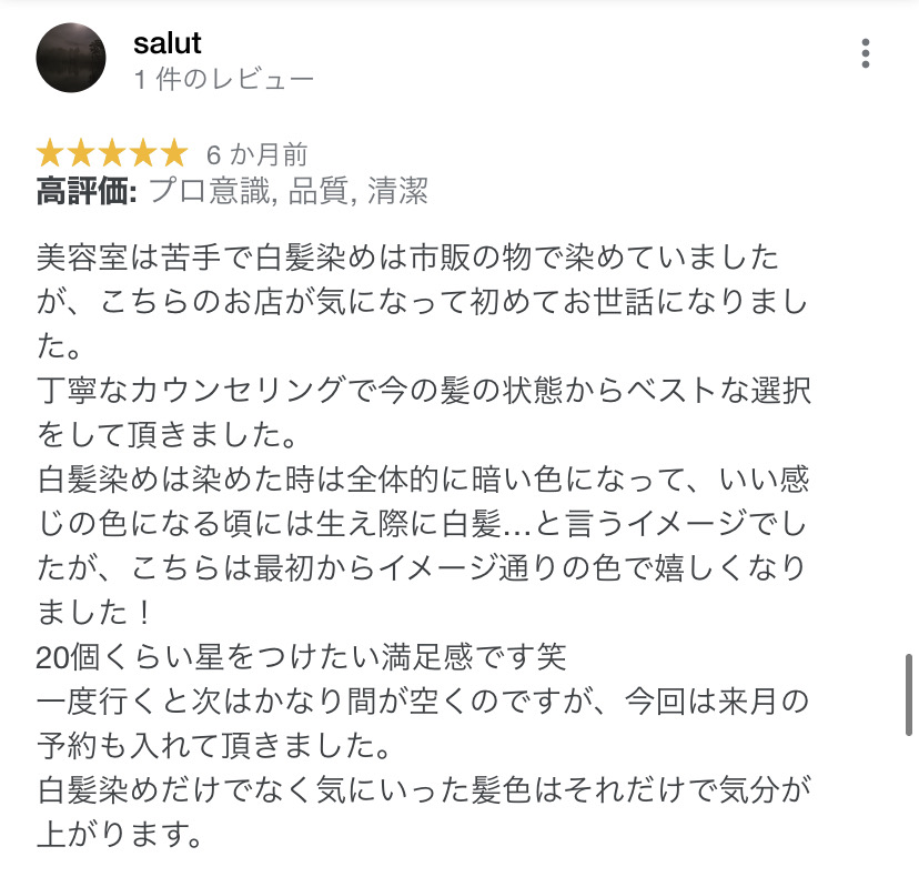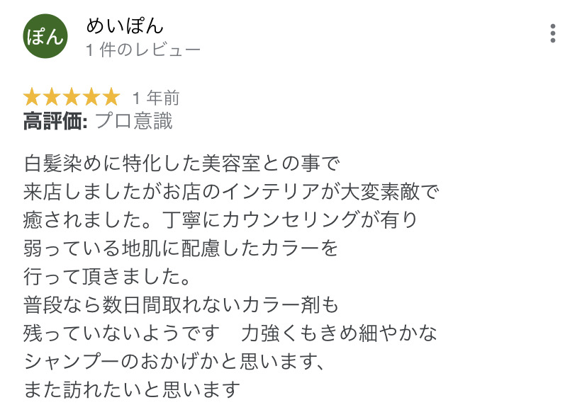 美容室は苦手で白髪染めは市販の物で染めていましたが、こちらのお店が気になって初めてお世話になりました。