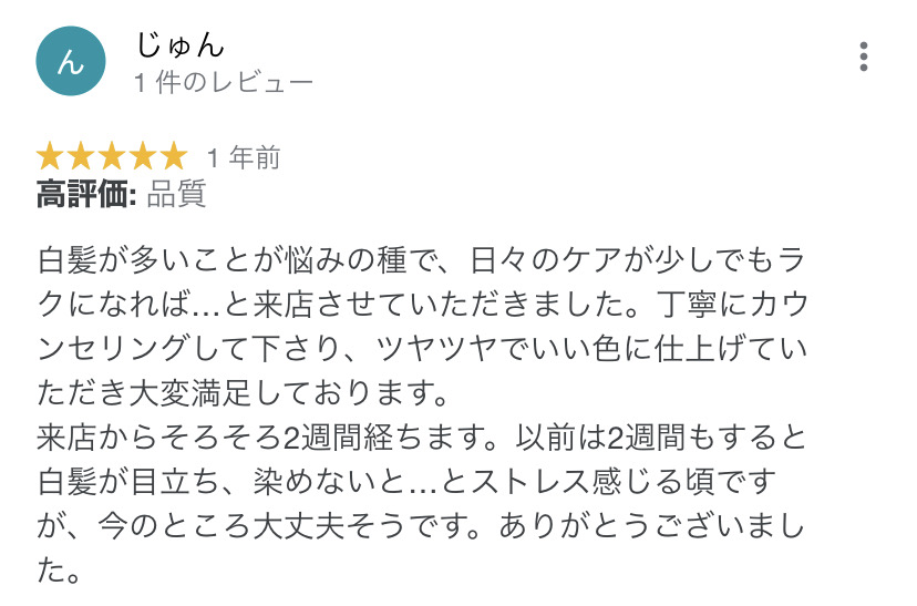 白髪が多いことが悩みの種で、日々のケアが少しでもラクになればと来店させていただきました。丁寧にカウンセリングして下さり、ツヤツヤでいい色に仕上げていただき大変満足しております。